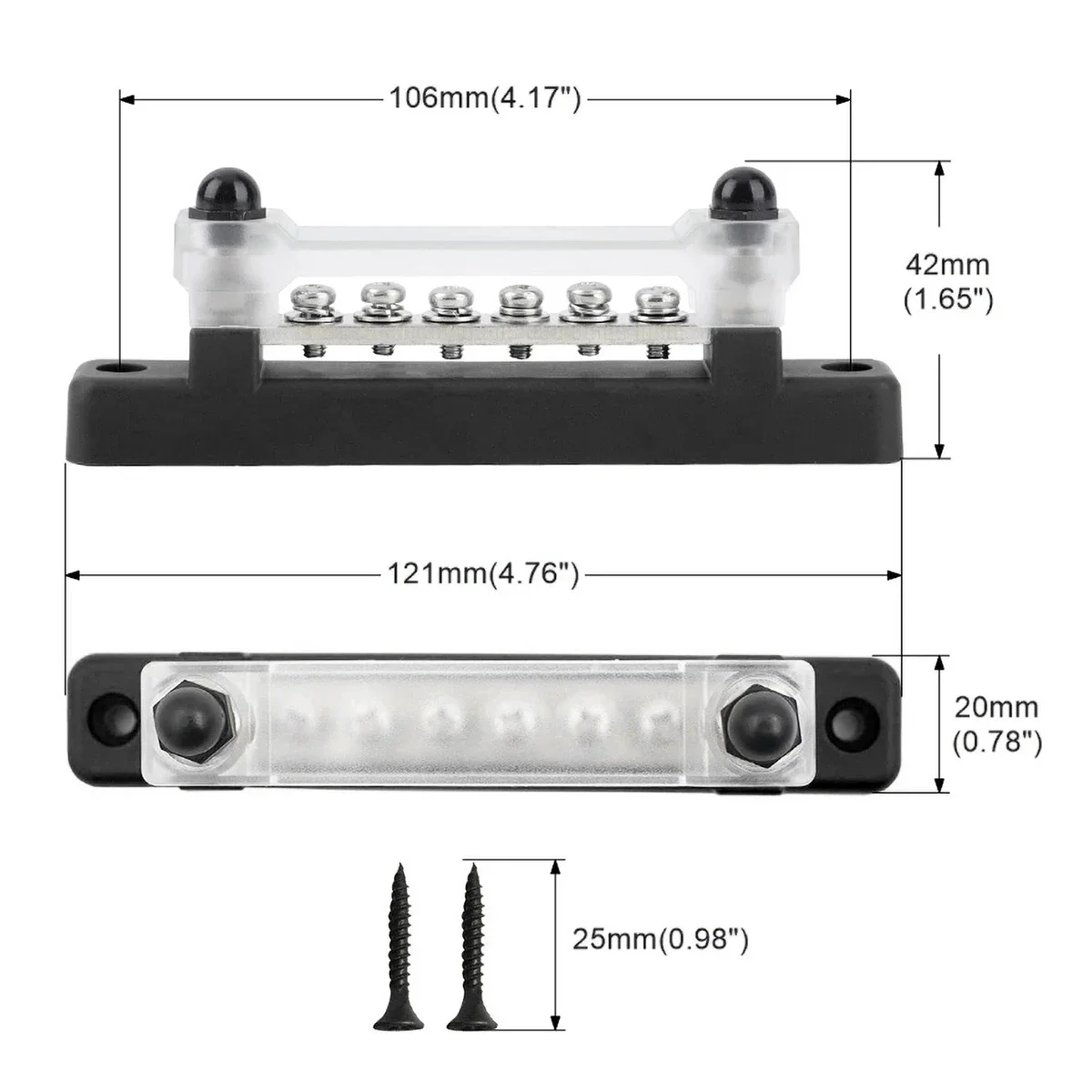 Connections: 2 x 6mm Studs, 6 X 4mm Screws (Nuts and Screws Provided)
