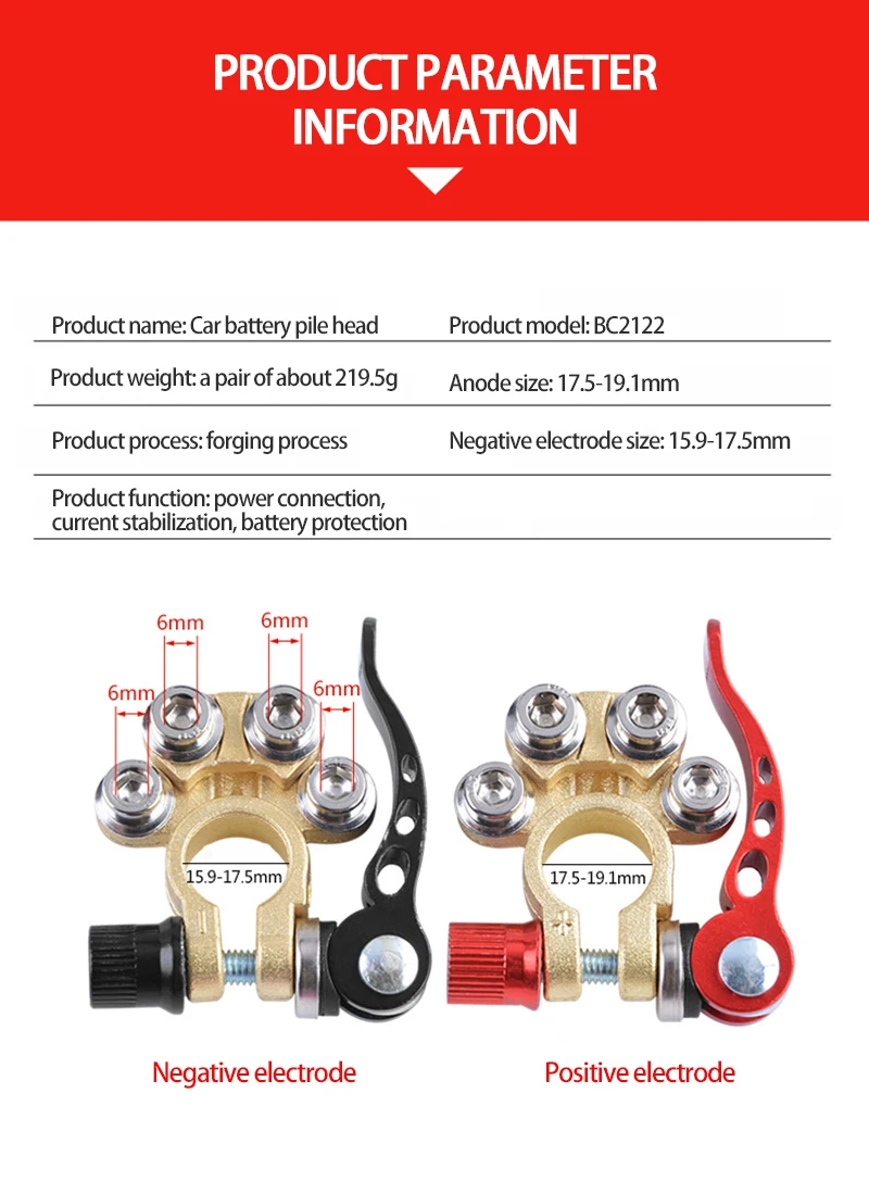 This kind of automobile battery pile heads can be used to stabilize the current and protects the battery, with strong corrosion resistance, strong conductivity and long service life.
