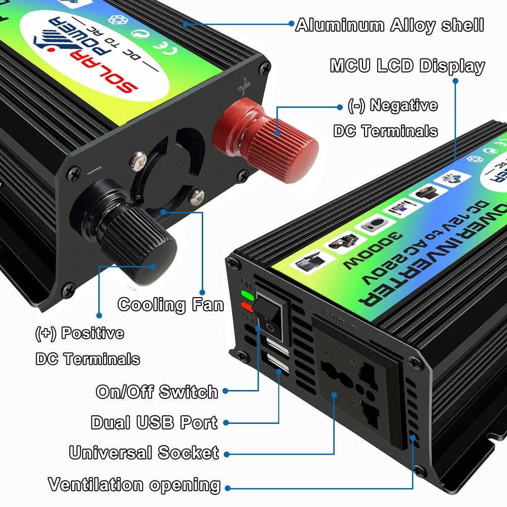 3000W Power inverter: Car power inverter with 2 USB ports and AC outlet. surge power: 3000W.