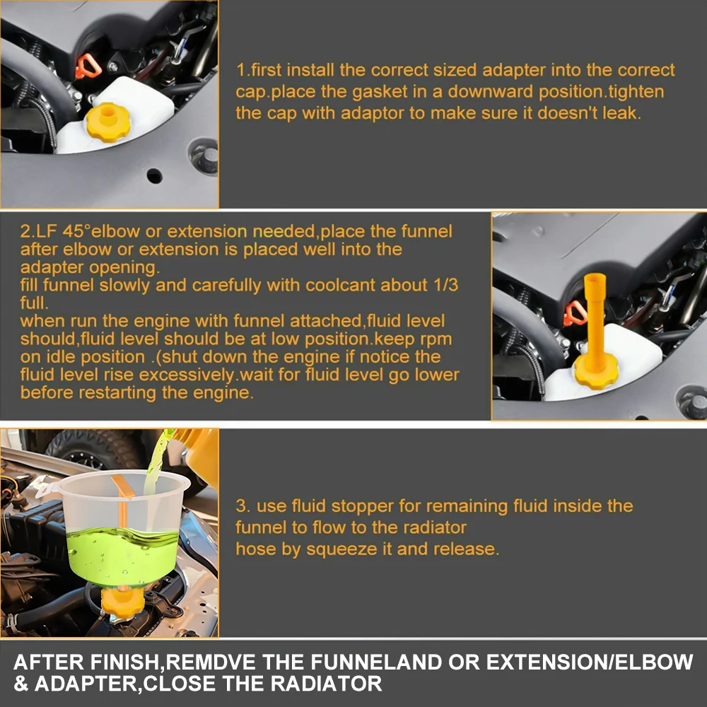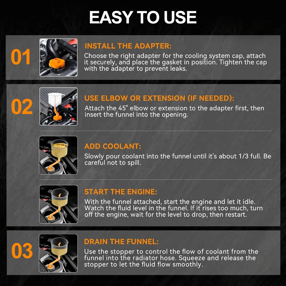 Spill-Free Operation:Prevents overflow and air pockets in the cooling system during filling. Includes a fluid stopper to avoid drips and air bubbles when removing the funnel, ensuring a clean and functional cooling system