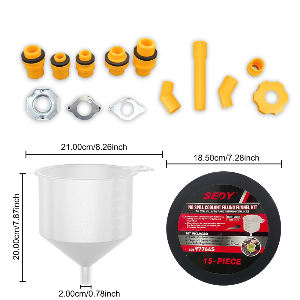 Flexible Extensions:The 5-inch straight extension and 2-1/4-inch 45° elbows allow for multiple configurations and easy access to hard-to-reach areas. The transparent funnel allows for quick visual inspection of the coolant, saving time and reducing hassle